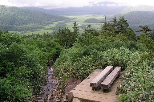 【森林限界のベンチ】 山の鼻から登ってきた場合、尾瀬ヶ原と燧ヶ岳が見えて感動する場所です。 |