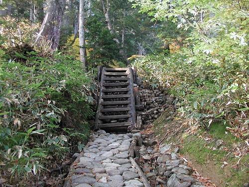 【樹林帯上部】 こんな感じの階段や石畳、木製階段が連続です。雨上がりには水がかなの溜まっていたりします。雨でなくても水たまりがあります。 |