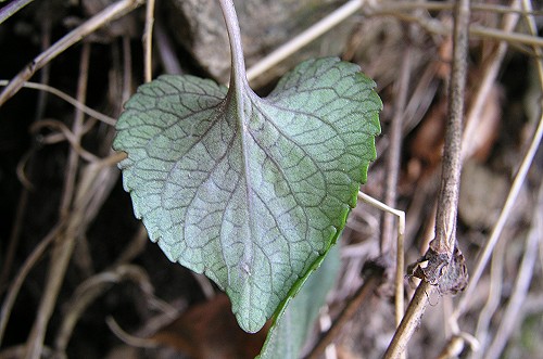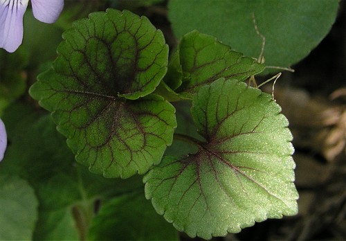 シロバナのタチツボスミレよりは個体数が多く、群落を作ることもあります。地域差もあると思いますが、比較的容易に見つけることが出来ます。 一般のタチツボスミレの葉よりやや色濃く見えるのは微細な脈にも赤色色素が入っているからだと思います。 | |