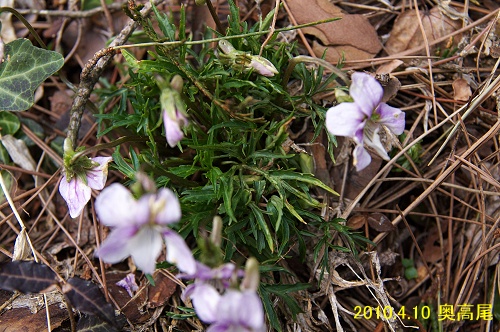 ![]() 撮影地:東京都八王子市・高尾山(2004.4.17) 葉は3裂ですがその先の小葉は分かれ方が不自然です。また、花弁の縁が波打たずすっきりしています。ヒトツバエゾスミレに近そうです。 |