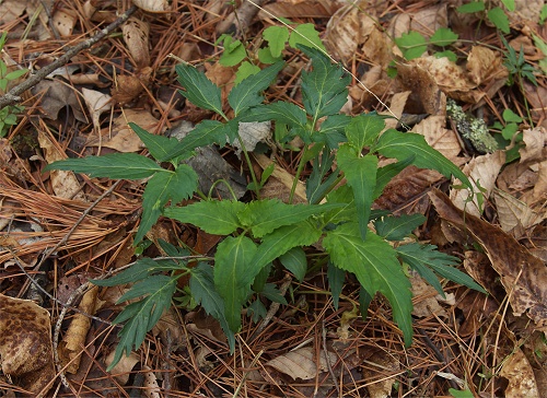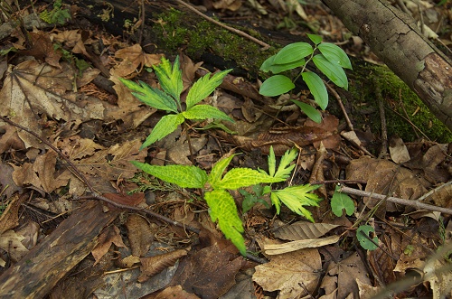![]() 撮影地:東京都八王子市・奥高尾(2010.4.10) 葉が細かく縮れになってます。3裂にも5裂にも見えます。奇形葉ですね。 |