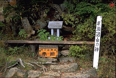 尾瀬沼三平下に小さな祠があるのをご存知だろうか? ナナカマドの木の下 にひっそりとある小さな祠であるが、山の通行安全を司る神様(女神だそうだ) が祭られている。尾瀬沼に行かれた折りには一度お参りをしてみてはいかがだ ろう。この祠に関する記述が祠の横に書いてあります。下の写真をご覧下さい。